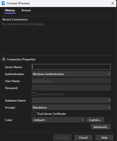The new connection dialog is very similar to the connection dialog box in Azure Data Studio (which has also been announced as being retired in February 2026), it makes switching between commonly used servers straight forward, allows you to set the default database to use when connecting and the service (SSAS, SSRS, database engine etc). This saves time and is a simple welcome change.